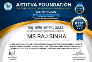 From Astitva Foundation in recognition of outstanding contributions made in providing education to Women in the field of cyber security at Bihar.